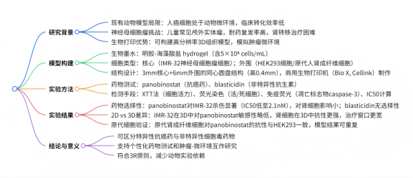 本文介绍了一种生物打印的3D 神经母细胞瘤模型,该模型以人源肾脏微环境(含人胚胎肾 293 细胞和原代人肾成纤维细胞)为背景,核心为携带 MYCN 和 ALK 基因扩增的 IMR-32 神经母细胞瘤细胞。通过测试panobinostat(组蛋白去乙酰化酶抑制剂)和blasticidin(肽基核苷抗生素)发现,panobinostat 在治疗有效浓度范围内可选择性诱导癌细胞凋亡而不影响肾细胞,而 blasticidin 对两种细胞均有杀伤作用;且2D 与 3D 培养的敏感性差异具有细胞类型特异性,使 3D 模型的治疗窗口更宽。该模型可高效测试抗癌药物的细胞毒性和肿瘤选择性,其开放式支架设计支持细胞类型替换,具有重要的药物测试价值。