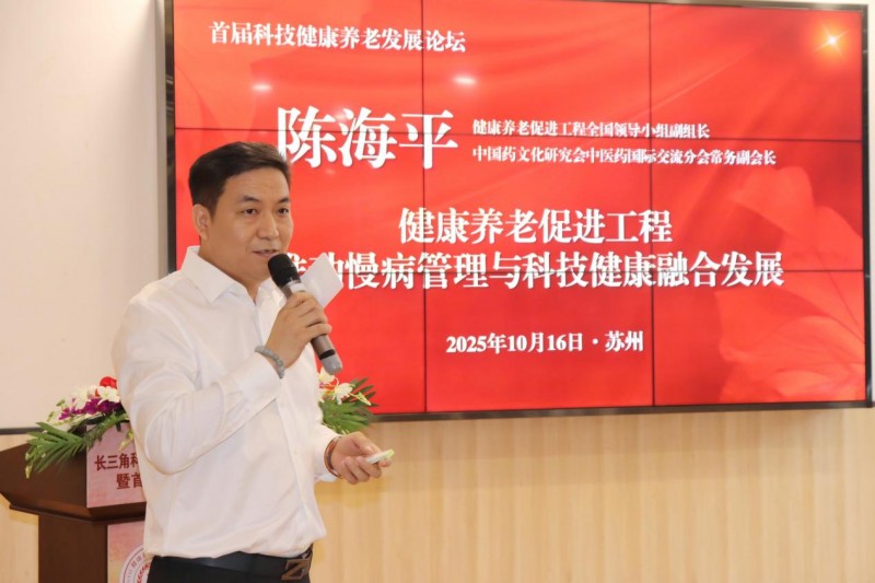 在首届科技健康养老发展论坛环节,健康养老促进工程全国领导小组副组长、中国药文化研究会中医药国际交流分会常务副会长陈海平做了题为《健康养老促进工程推动慢病管理与科技健康融合发展》的演讲报告,为慢病管理提供“预防-监测-干预”的闭环解决方案,推动中医药与现代科技深度融合。