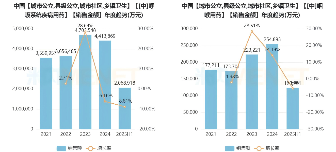 米内网2025H1呼吸/咽喉品类数据,呼吸类中成药医疗端进一步下降(-8.8%)、咽喉类中成药医疗端也在2021年后首现下降(-5.6%),这与呼吸道感染趋势回落密切相关。