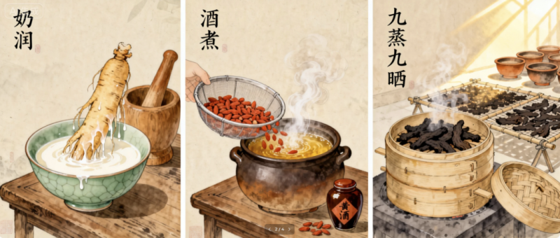 清宫寿桃丸制作技艺之精妙,尤以“奶润酒煮”与“九蒸九晒”这两大绝技为甚,堪称点睛之笔。其中“奶润”是指人参的炮制工艺,现采用牛乳替代,功效不变,人参经奶润后可降低其燥性,使药性更加温和。“酒煮”是指枸杞子的炮制技艺,需以精选的糯米、酒曲等原料酿造而成的醇厚芳香黄酒为引,酒煮前更需细细筛拣,去净杂质,剔除脱落的果梗,确保药材的纯净与道地。此后,以酒煮之,取其精华熬制为膏。地黄的炮制则更是耗时费力,彰显匠心独运。清宫寿桃丸所选用的地黄个体肥大,质地紧密,难以蒸透,因此采用“九蒸九晒”的古老技艺。经黄酒浸润后,历经九次蒸煮、九次暴晒,整个蒸晒过程横跨三九之期,历时之久,工序之繁,可见一斑,充分体现了清宫寿桃丸制作工艺的精髓,也凝聚了千百年来传统中医药的智慧结晶。