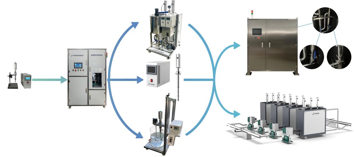 我们可以提供从实验室到生产线的全套超声波设备,用于批量或实验处理任何体积的分散和解聚。实验级声化学设备用于容量500ml到约1L的实验烧杯。工业超声波设备用于工艺开发和生产,多套可组成完整的产线设备。